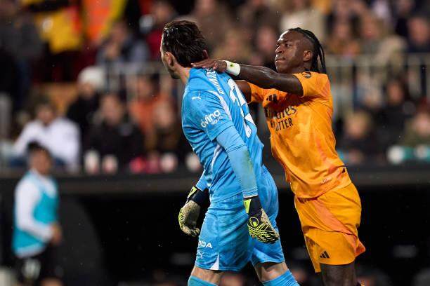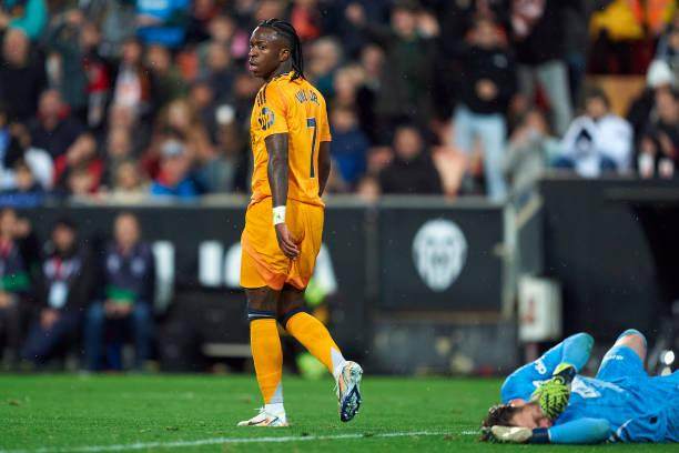 瓦伦西亚抢得先手,进球前乌戈·杜罗和富尔基耶已经各有一次极有威胁的射门被库尔图瓦挡出,但门迪和吕迪格这一侧还是关不紧门。富尔基耶再次插上终于打开空当,哈维·格拉前点射门被库尔图瓦勉强扑出,杜罗补射破门。不过这次进攻的发端,是瓦伦西亚后卫对罗德里戈犯规断球,皇马开始对判罚感到不满。